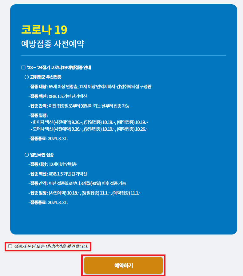 3. 버튼을 누르고 나면 접종자 본인 또는 대리인임을 확인한다는 알림과 함게 예약하기 버튼이 나오는데 누르세요.