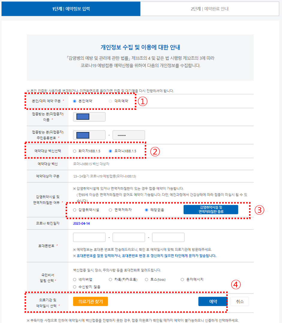 5. 단계별 예약 정보를 입력하는 창이 나오는데요. 여기서 본인예약을 할것인지? 아니면, 대리예약을 할 것인지를 우선 선택해줍니다. 그리고 나서, 화이자와 모더나 중에 백신 종류를 선택해 주시고 감염취약시설이나 면역저하자 여부를 선택해 주시면 됩니다. 그리고 나서 의료기관을 찾아서 예약을 해주시면 코로나19 접종 사전예약이 완료됩니다.