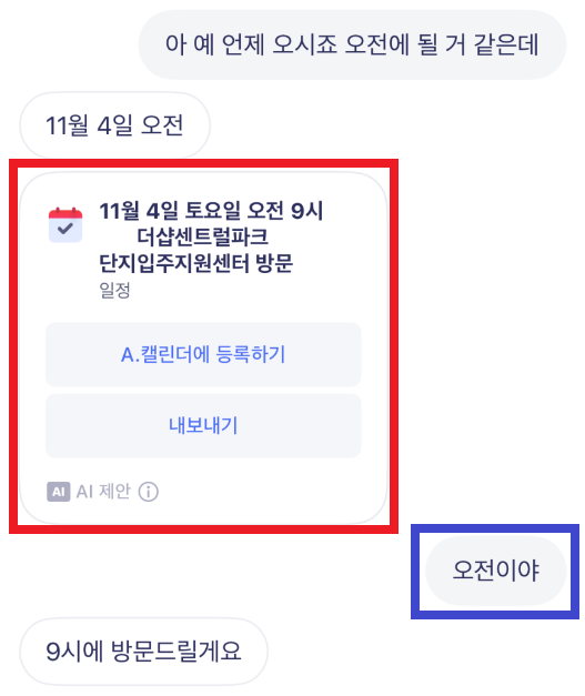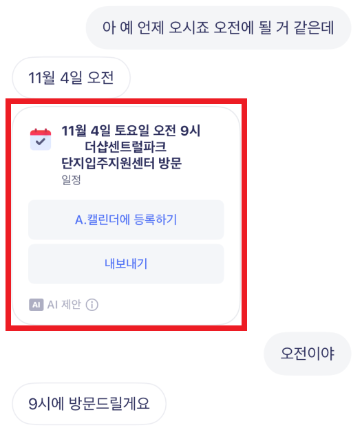 예를 들어, 'OOO과 대화 후 토요일 오전 9시 방문'과 같이 요약돼 저장되어 있었고, 거기에 더해 ai가 캘린더에 등록여부까지 확인하는 기능이 있어요.