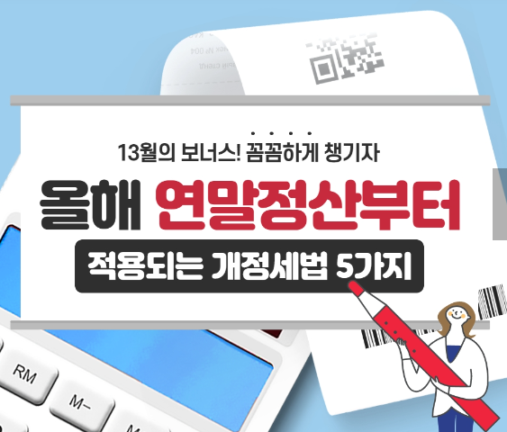 오늘은 13월의 보너스라고 할 수 있는 연말정산의 새롭게 적용되는 세법 5가지에 대하여 확인해 보았는데요. 여러분들도 미리미리 변경된 세법을 확인하시고 연말정산으로 손해보지 않도록 하세요.