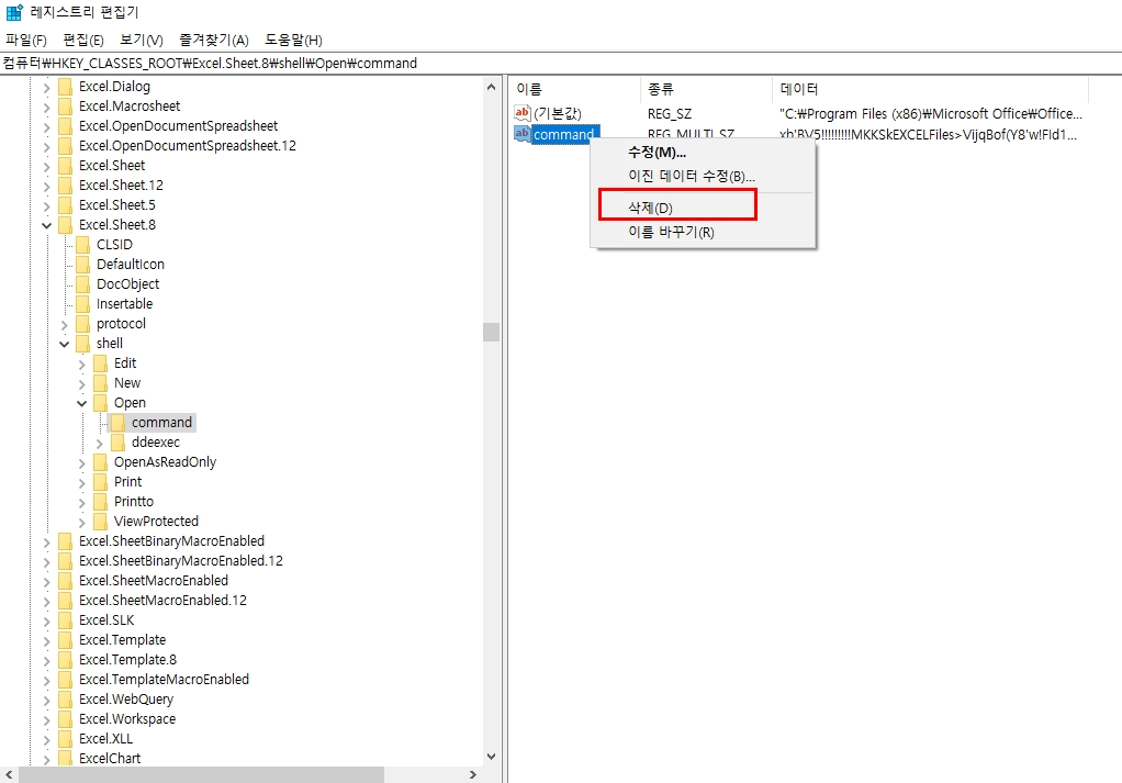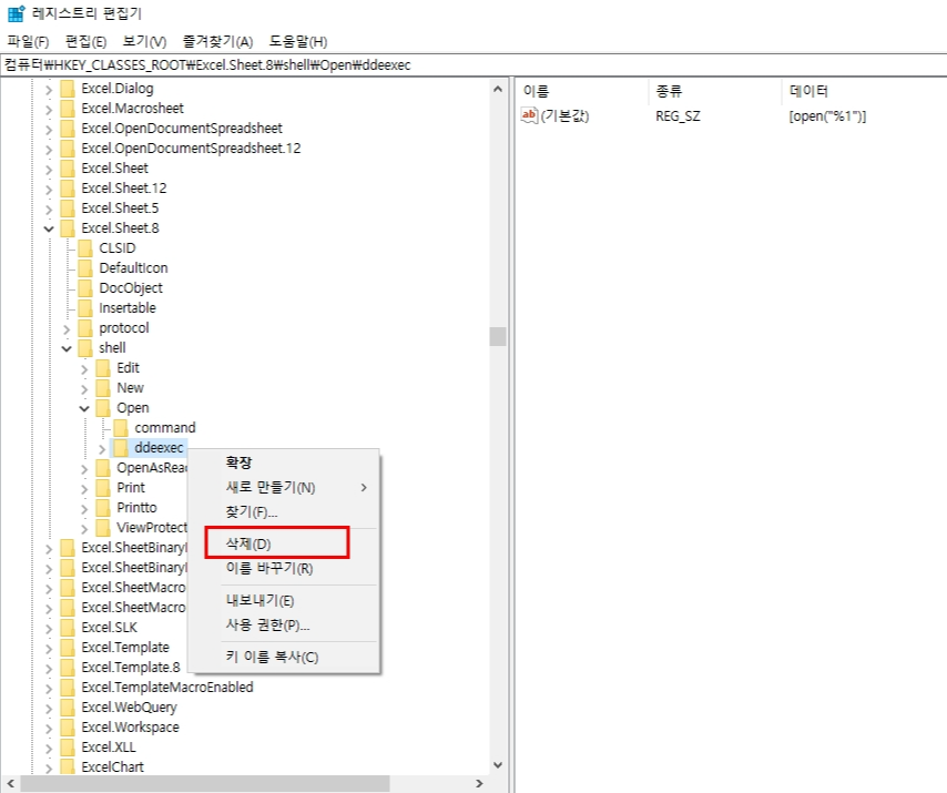 HKEY_CLASSES_ROOT > Excel.Sheet.8 > shell > Open