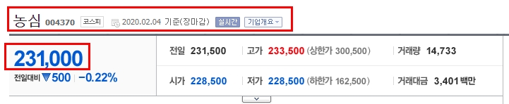 금일 주식 가격은 231,000원 이군요.