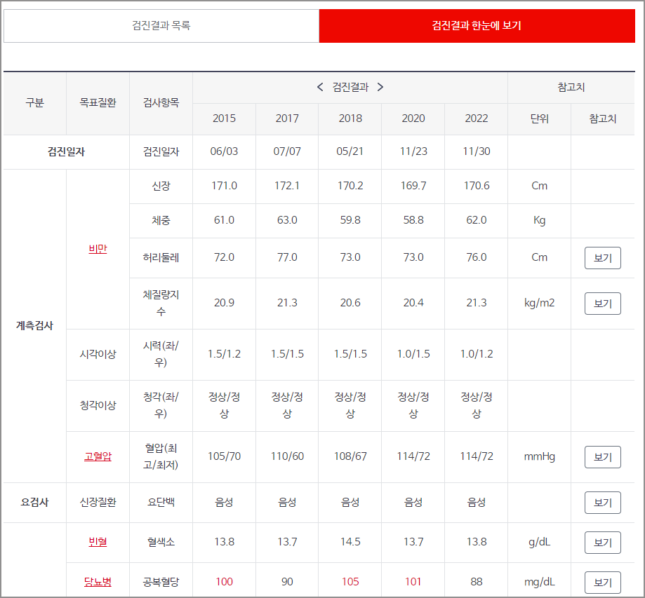 "검진결과 한눈에 보기"를 클릭하게 되면 검진결과 연도별로 같은 항목에 대한 수치 값을 비교하면서 확인이 가능합니다.