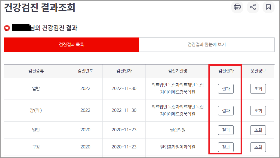 - 상단 탭 "검진결과 목록"을 통해 년도별 검진결과를 클릭하여 확인하세요.