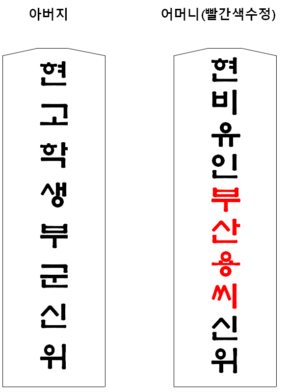 - 예를 들어, 제주의 아버지인 경우 "顯(현)考(고)學(학)生(생)府(부)君(군)神(신)位(위)"와 같이 적습니다.