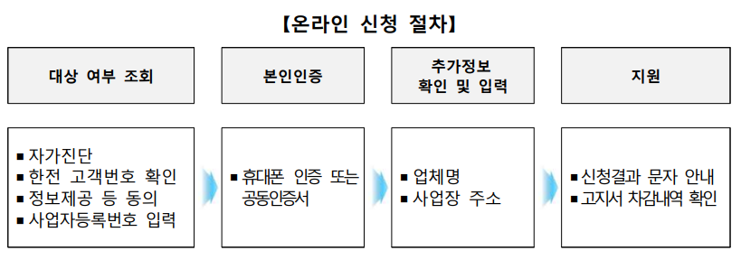 - 신청방법: 온라인 간편 신청은 "소상공인전기요금특별지원.kr"에서 가능