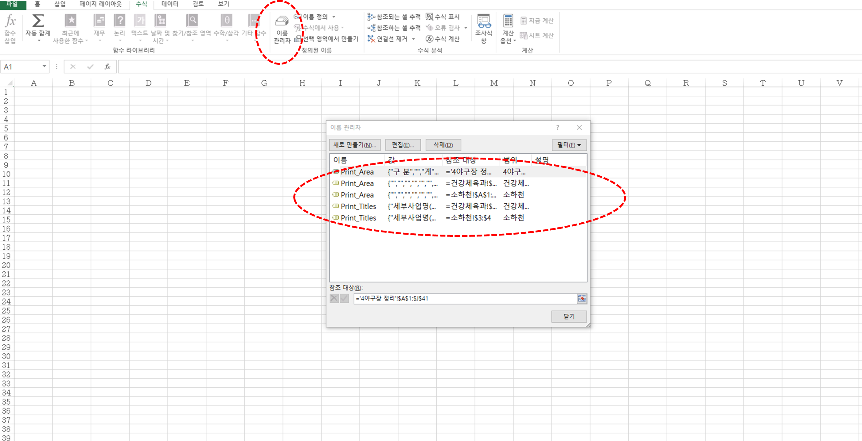 아래의 빨간 동그라미(수식 - 이름관리자)를 클릭하시면..