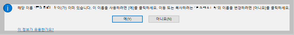 "해당 이름'000000'이 이미 있습니다. 이 이름을 사용하려면 [예]를 클릭하세요. 이동 또는 복사하려는 '00000000'의 이름을 변경하려면 [아니요]를 클릭하세요. "