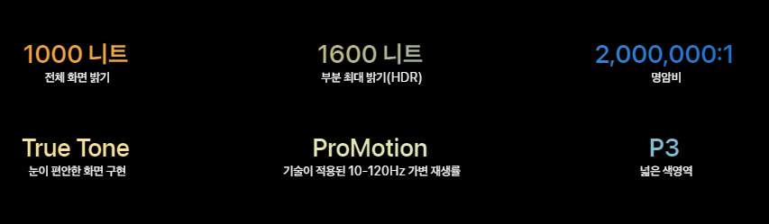 True Tone, ProMotion 등의 기술도 더해져 색 재현력, 밝기, 반응 속도에서 전례 없는 시청 경험을 선사합니다.