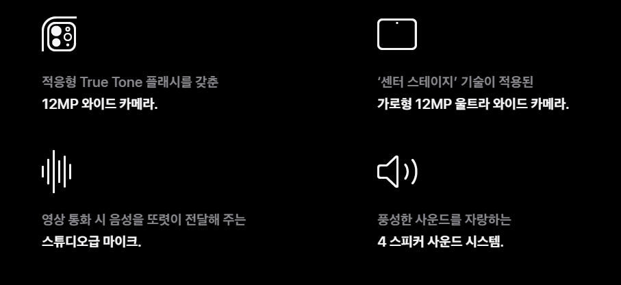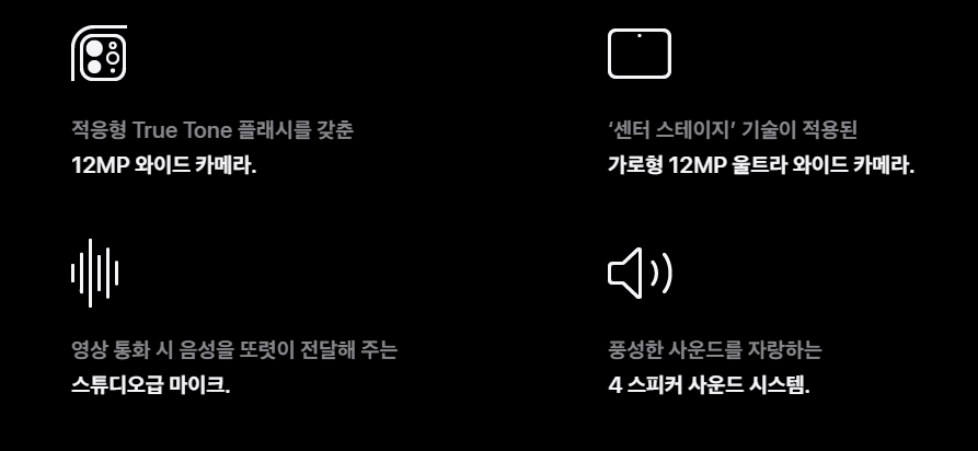 12MP 울트라 와이드 렌즈 카메라에는 '센터 스테이지' 기술이 적용되어 영상 통화 시 배경을 선명하게 분리해 피사체를 더욱 돋보이게 해줍니다. 전면 카메라 역시 가로형으로 배치되어 원활한 영상 통화가 가능합니다.