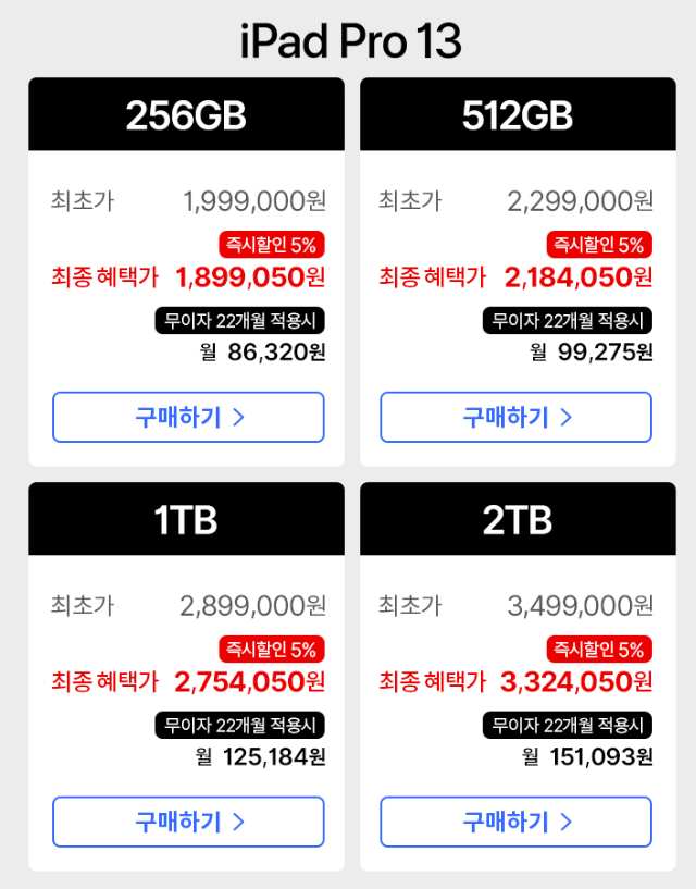 - 아이패드프로 13인치: 1,999,000원