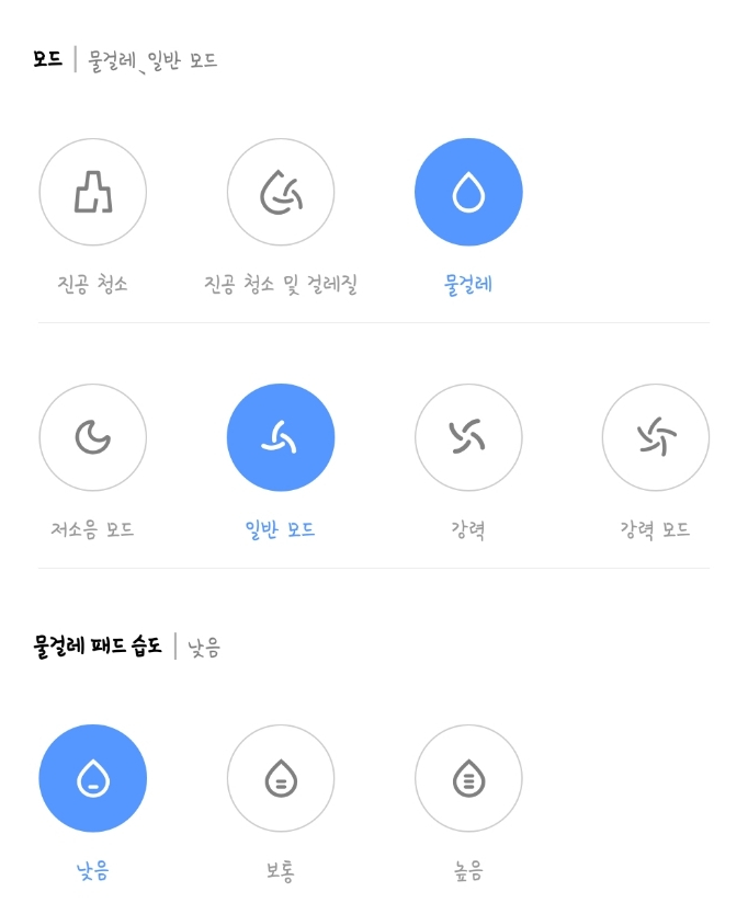 - 물걸레 패드 습도 설정: 낮음, 보통, 높음