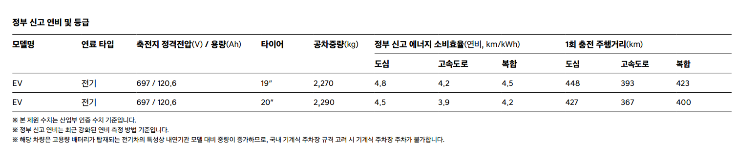 - 20인치 휠 기준: 도심 4.5km/kWh, 고속도로 3.9km/kWh, 복합 4.2km/kWh