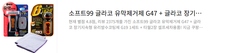 - [소프트99 글라코 유막제거제 G47 + 글라코 장기지속형 유리발수코팅제 G19 1세트 + 타월2장