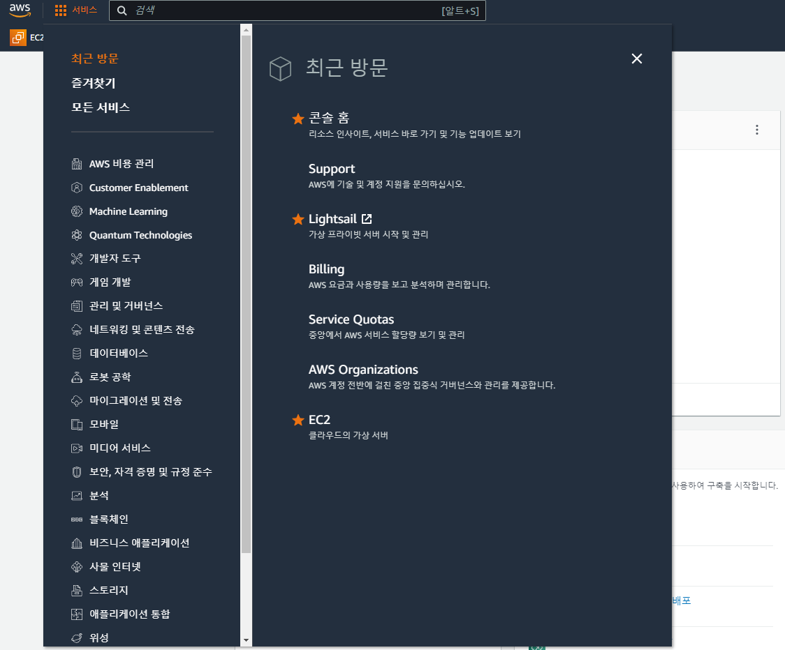 일단 아마존웹서비스에 가입하여 들어가 보면 aws 콘솔 홈이 나온다.