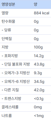 아래는 100g의 참기름에 포함된 주요 영양성분입니다.