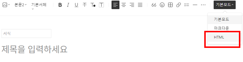 그러면 글쓰기 창이 나오는데 HTML모드로 변경해 주세요!