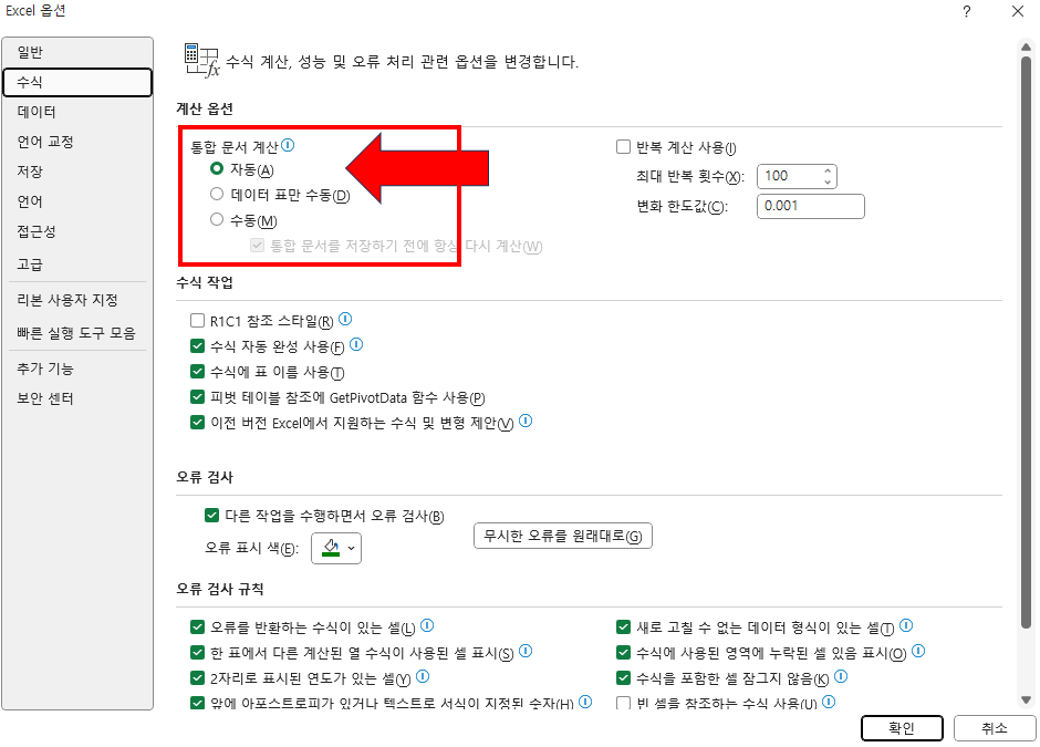 이럴 때는 수식을 강제로 다시 계산하도록 설정할 수 있어요.