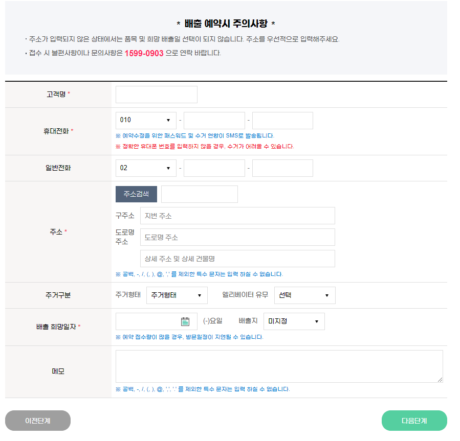배출희망일자는 지역별로 배출이 가능한 날짜로 미리 확인하시고 정해주세요.