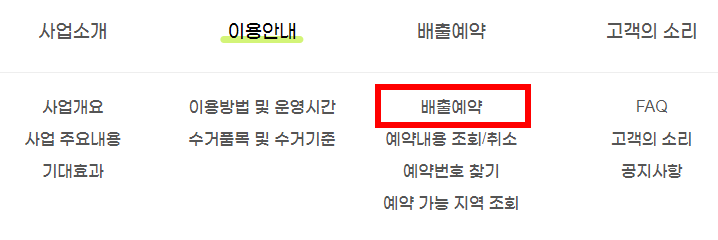 2. 상단에 있는 이용안내에서 메뉴에서 배출예약으로 들어갑니다.