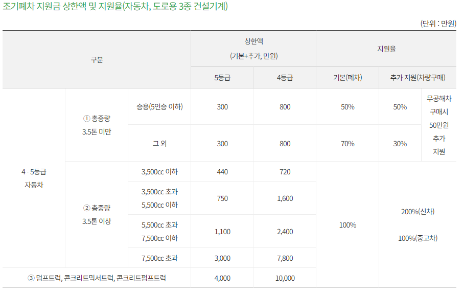 조기폐차 지원금은 상한액이 존재하며, 5인승 이하 일반승용차의 경우 4등급은 최대 800만 원, 5등급은 최대 300만 원까지 지원됩니다. 지원금은 차량 정보에 따라 산정되며, 보조금 추가 지원이 가능한 경우도 있습니다. 소상공인, 저소득층, 차상위계층 등은 추가 지원을 받을 수 있으므로, 서류를 잘 준비하여 신청하세요.