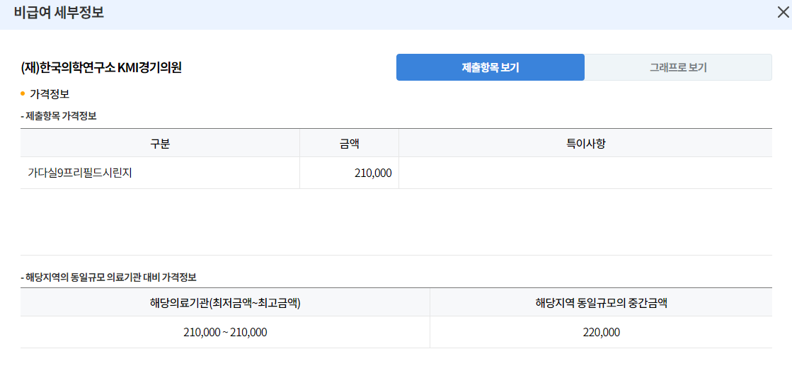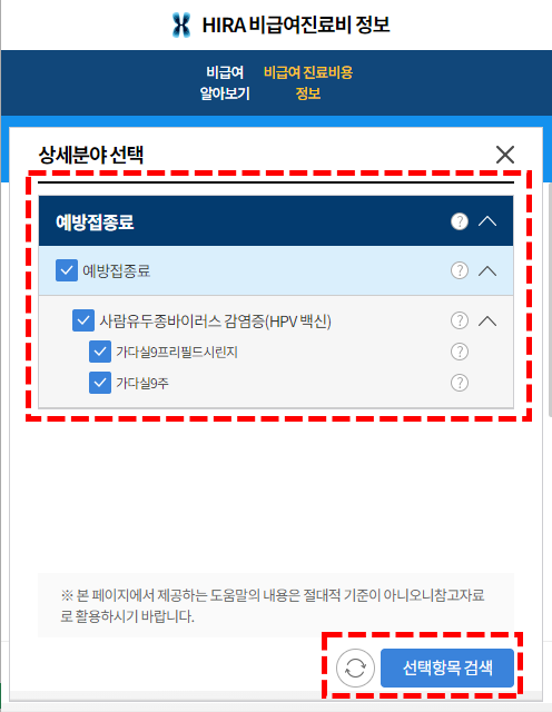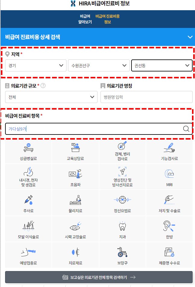 2. 본인이 주거하고 있는 지역을 선택하시고 비급여 진료비 항목* 으로 가셔서 "가다실9가"를 입력해주세요.